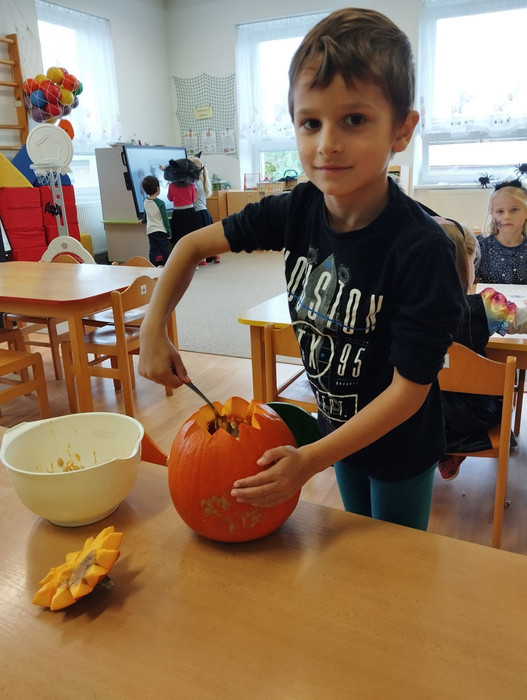 Ve čtvrtek 31. listopadu jsme s dětmi oslavili Halloween. Paní učitelky měly pro děti připravené různé strašidelné aktivity - soutěživé hry, pokusy, tančení, vyrábění a dlabání dýně.