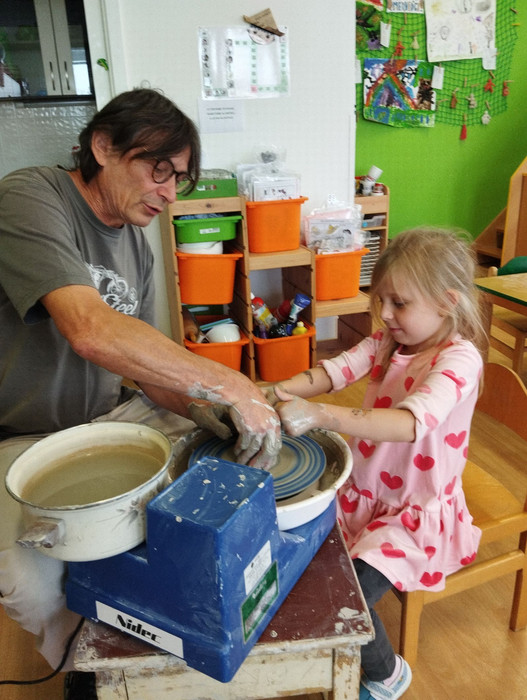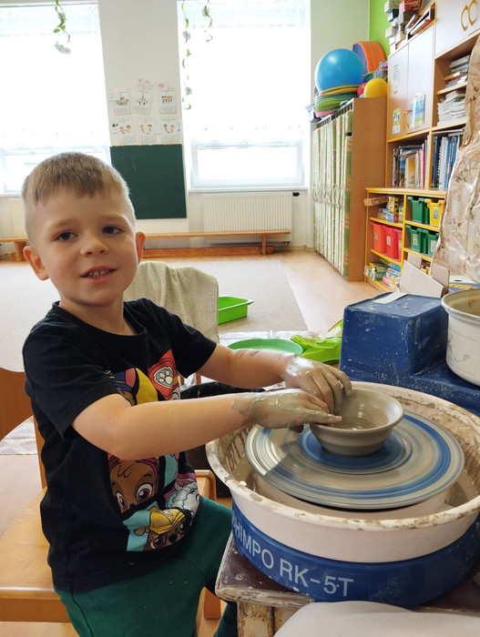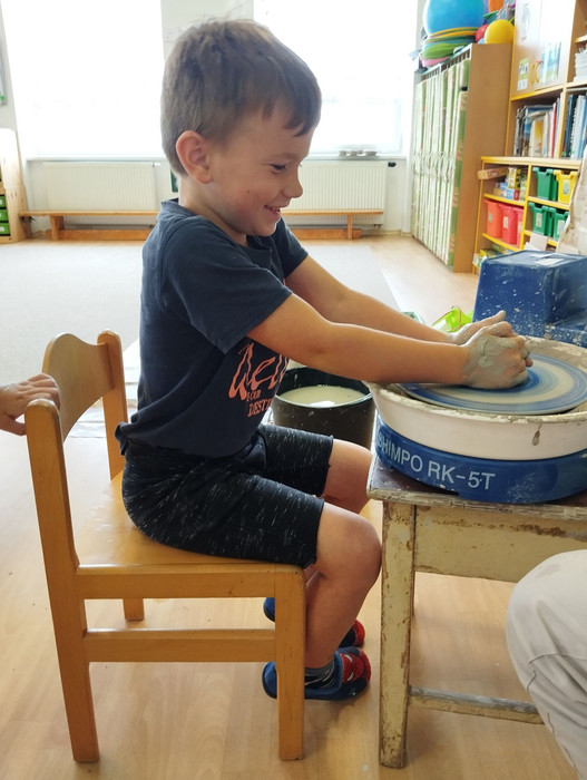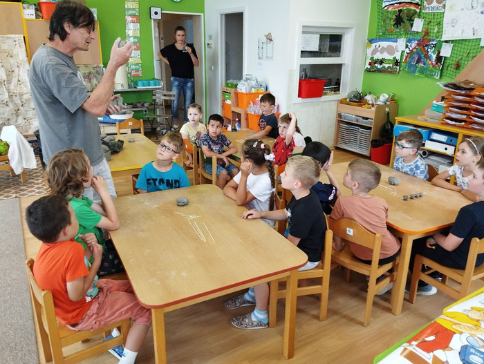 Ve čtvrtek 13. 6. k nám do mateřské školy zavítal vzácný host, a to pan hrnčíř. Seznámil děti s tím, jak se pracuje s hlínou a jak se liší od plastelíny. Děti měly také možnost vyzkoušet si práci na hrnčířském kruhu a vytvořit si svou vlastní mističku. Děkujeme za milou návštěvu a těšíme se na příště.
